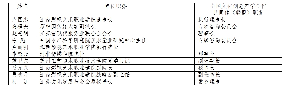 成员:马元兴 全国文创产学合作共同体(联盟)秘书长、江南影视艺术职业学院副院长