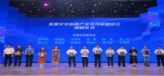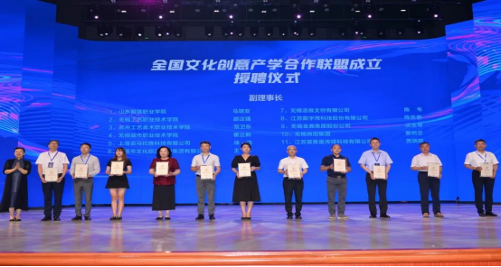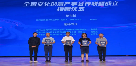 全国文化创意产学合作联盟由中国国际文化艺术中心、江苏省现代服务业联合会、河北传媒学院、江南影视艺术职业学院联合发起成立。一年多来,得到中国艺术职业教育学会的直接指导和全国200多家高中等院校、科研机构、文旅企业的积极响应。江苏省委教育工委副书记苏春海出席会议并作重要讲话;无锡市副市长秦咏薪参加启动仪式并为理事长单位颁发证书。