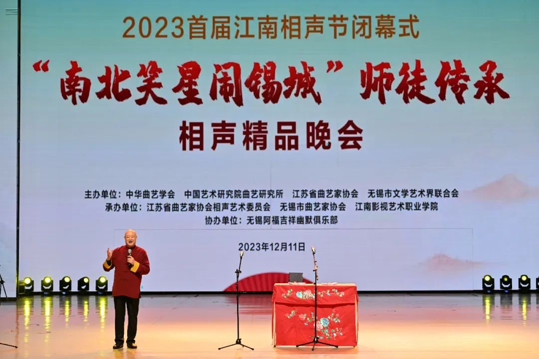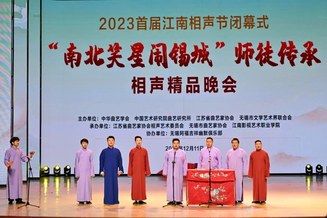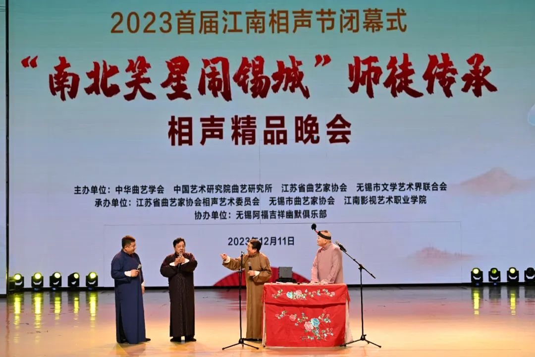 12月11日,由中华曲艺学会、中国艺术研究院曲艺研究所、江苏省曲艺家协会、无锡市文学艺术节联合会主办,江苏省曲艺家协会相声艺术委员会、无锡市曲艺家协会、江南影视艺术职业学院、中国艺术职业教育学会文化创意工作委员会承办,无锡阿福吉祥幽默俱乐部协办的2023首届江南相声节闭幕式——“南北笑星闹锡城”师徒传承相声精品晚会在我校彩虹剧院举行。无锡市文学艺术界联合会党组成员、副主席周军,无锡市曲艺家协会名誉主席张建平,江南影视艺术职业学院党委副书记兼执行院长卢丽明,副院长马元兴、冯渊、薛晗在现场和江影师生们一起观看了晚会。