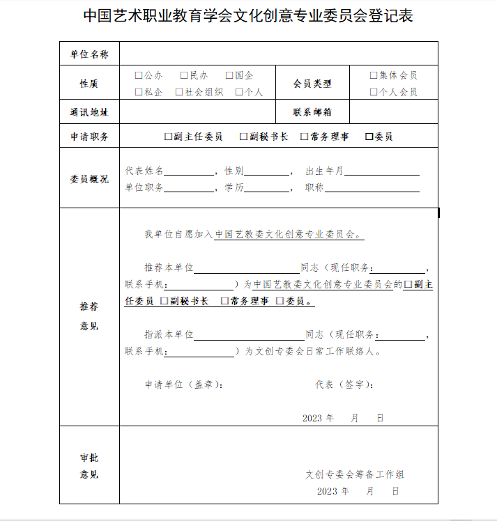 三、凡自愿加入中国艺教会文化创意专业委员会的单位和个人,请填写中国艺术职业教育学会文化创意专业委员会登记表(见附件),于2023年8月30日前反馈文创专委会筹备工作组。